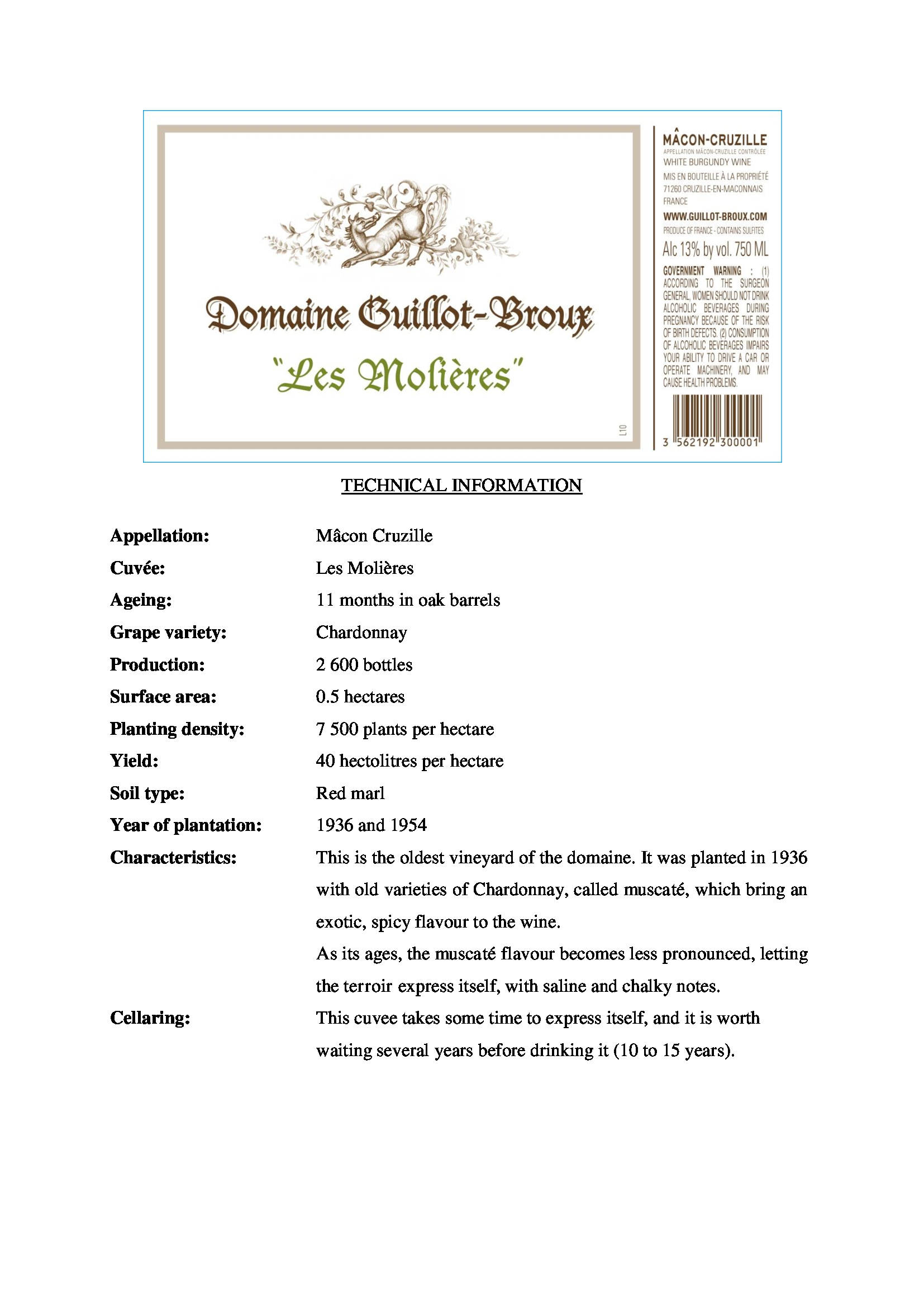 Les Molières is situated in the village of Grevilly (one of the three villages that make up the appellation of Cruzille) and is oriented south-west. The soil is mainly red marl, on a bedrock of thick limestone. What makes Les Molières special is that it was planted (in 1936) with a variety of Chardonnay known as Chardonnay Muscaté, an old cross between Chardonnay and small-berried Muscat de Rivesaltes. The wine is always very aromatic thanks to the influence of the Muscat grape, but also saline and mineral because of the strong limestone terroir. It is the oldest vineyard of the Domaine.