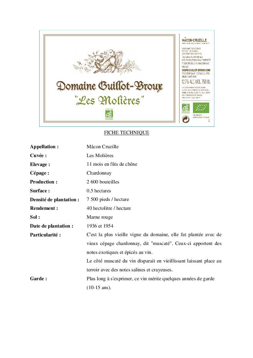 Les Molières sont situées sur la commune de Grevilly (l’un des trois villages de l’appellation Mâcon Cruzille) et sont orientées sud – ouest. Le sol est constitué principalement de marne rouge, sur une plaque de calcaire épaisse. La particularité des Molières est d’être plantées en 1936 avec de vieux chardonnay muscaté, croisement ancien du chardonnay et du muscat de rivesaltes à petits grains. C’est un vin toujours aromatique du fait de l’influence du muscat et très salin et minéral du fait du terroir extrêmement calcaire. C’est la plus vieille vigne du Domaine.